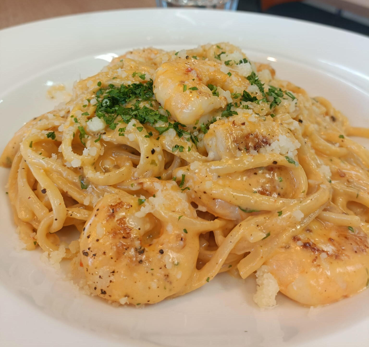Linguine i krämig sås med chilimarinerade jätteräkor och parmesan.