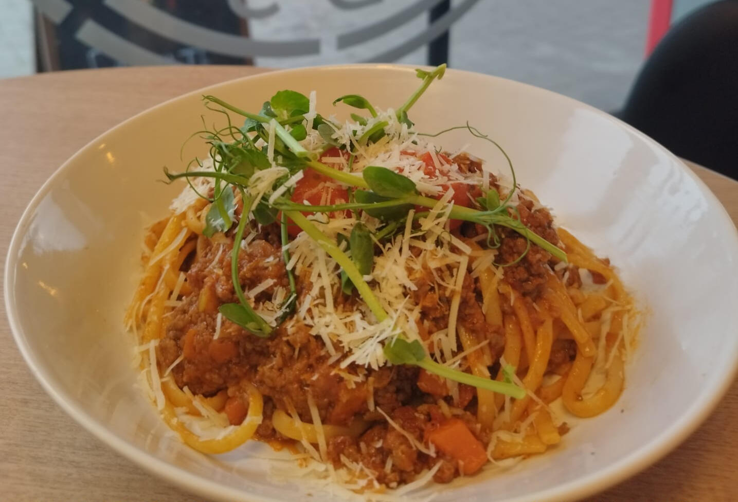 Linguine med långkokt oxkött, örtkryddade körsbärstomater och parmesan.
