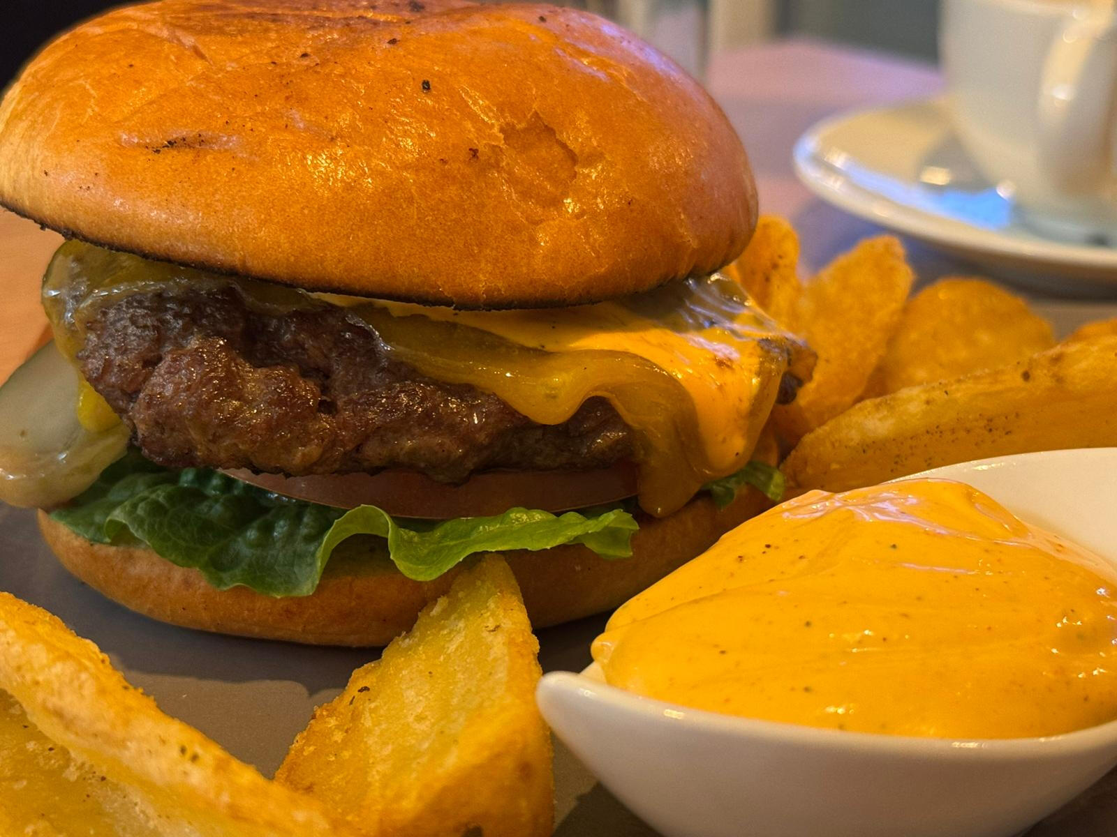 Nötköttsbiff, saltgurka, sallad, tomat, rödlök, cheddar, majonnäs.
