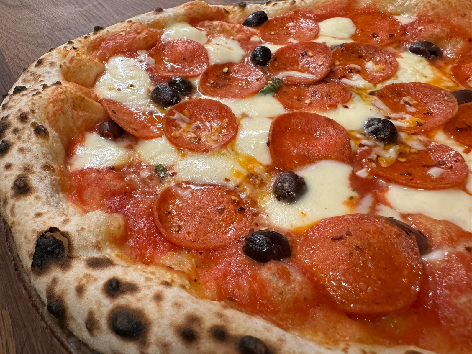Tomatsås, fior di latte, basilika, pepperoni, oliver, parmesan, chiliflingor.